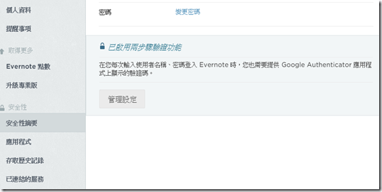 (6) 認證完之後, evernote 會要求你透過管理設定安裝 APP 在你的行動裝置上, 日後在登入 evernote 時除了要輸入原來密碼之外, 還需要透過 google 的 authenticator 應用程式產生的密碼進行登入.